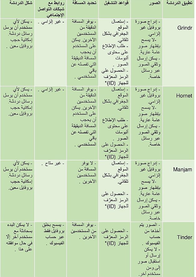 ولكن وإن كانت تلك التطبيقات تعطي انطباعاً عاماً بأنها متشابهة، فإنها لا تؤدي بالضرورة إلى نفس النوع من التواصل بين الأفراد، والأهم من ذلك، أنها لا تعرّض مستخدميها إلى نفس أنواع المخاطر. وطبعاً في المنطقة العربية حيث المثلية الجنسية هي جرم، توخّي الحذر في استخدام تلك التطبيقات ضروري.