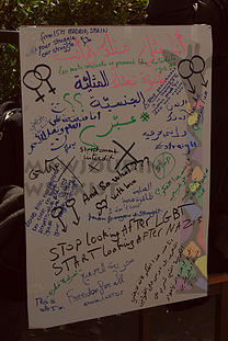 After the rally, the activists held a stand in a private university as part of the event to raise awareness about LGBTI rights, regarded by a vast segment of Tunisian society as a “perversion” and a “sickness.” They raised posters calling for the respect of a person’s sexuality and agency over one’s body.